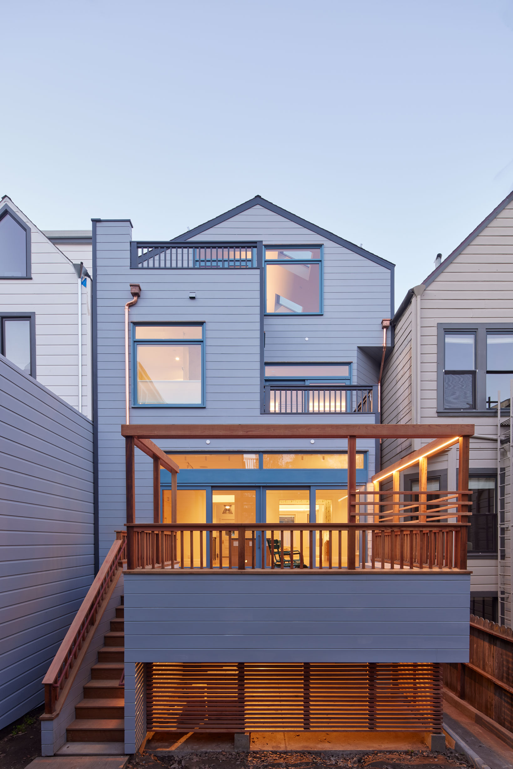 This gut-remodel of a 1909 Victorian home in San Francisco’s recently designated Duboce Park Historic District was a masterclass in client collaboration. The new homeowners requested something that's become our specialty: connecting inviting, modern interior spaces with the California climate. We decided to give the south-facing rear of the house exterior decking, opting for balconies on all upper levels. The resulting layout required only minor changes to the building envelope, with a 75 square foot, single-story addition that extended the kitchen/dining area and a simple dormer setback capturing 600 square feet of attic space — without affecting the historic front facade. When we were through, all 4 levels boasted access to the outdoors.